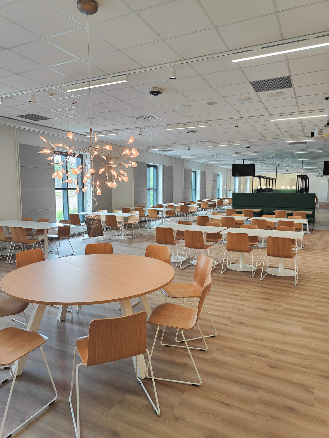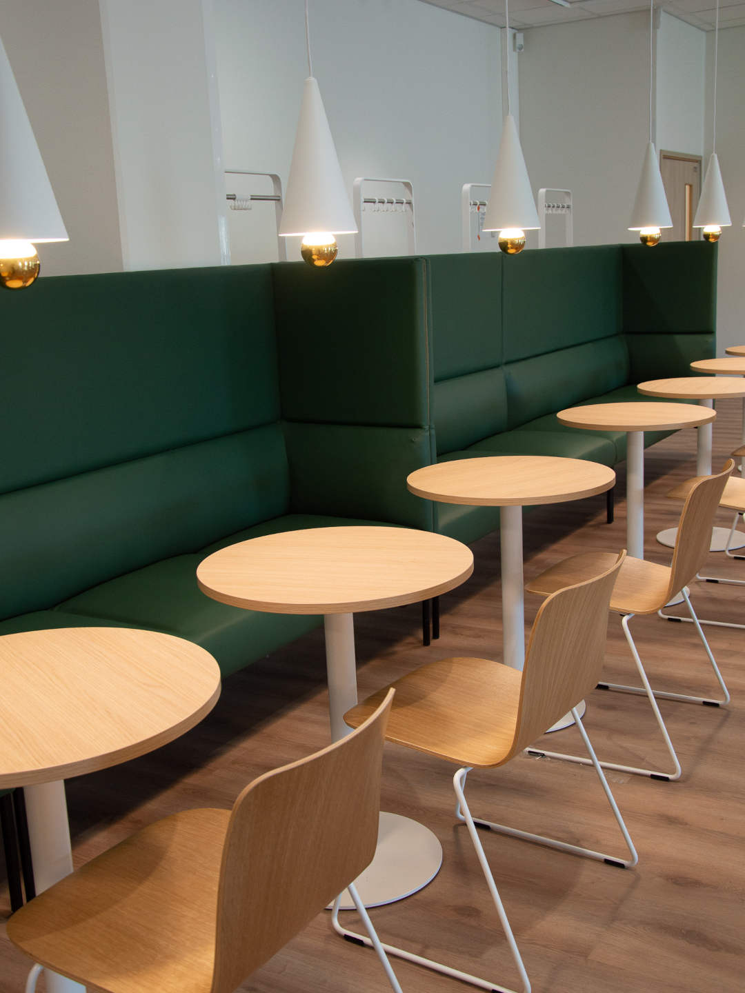 Vastasimme erityisesti Nesteen uuden lounasravintolan pintamateriaalien, kalustuksen, värimaailman ja tunnelman
