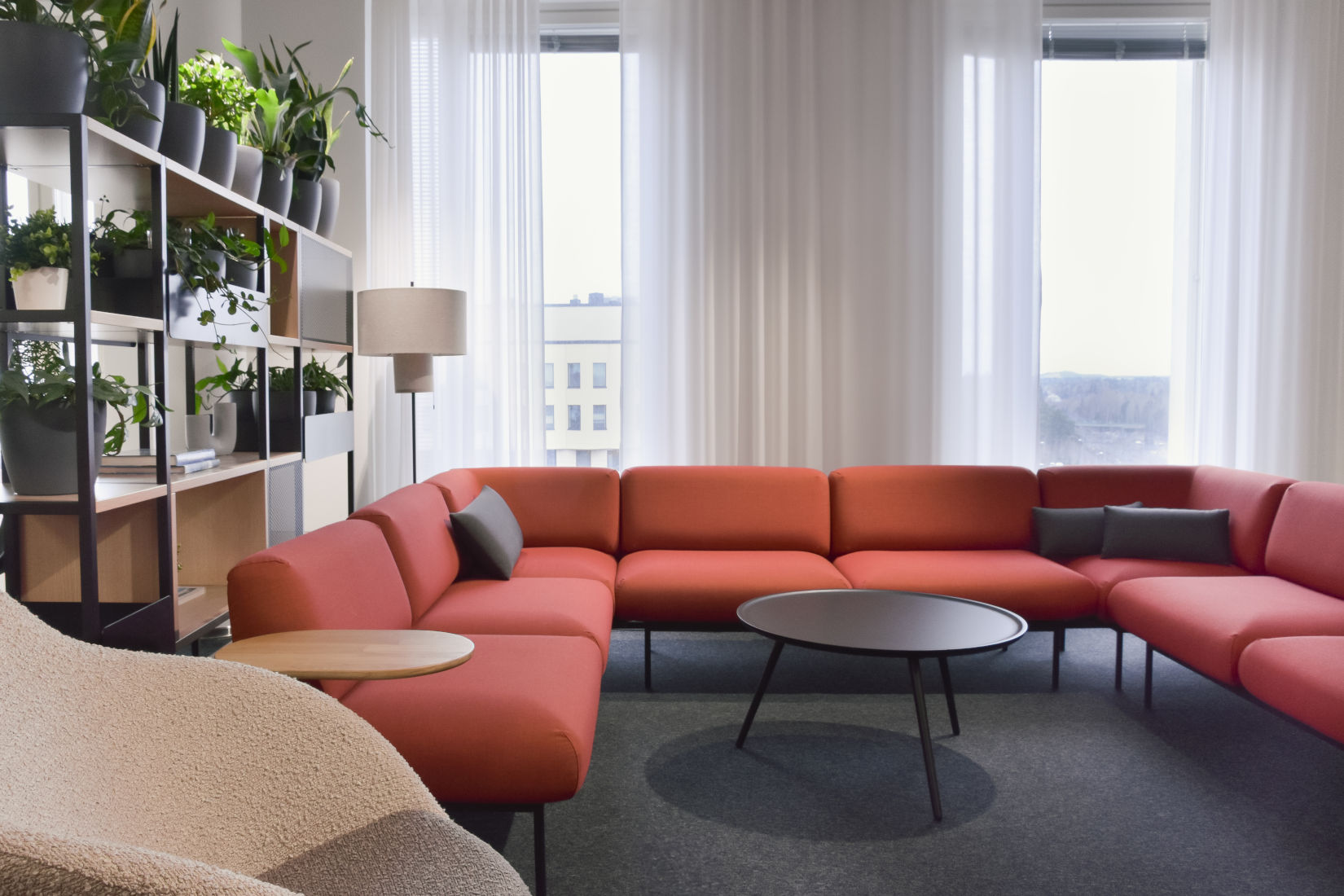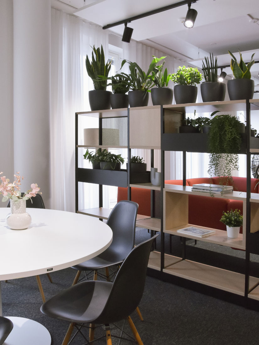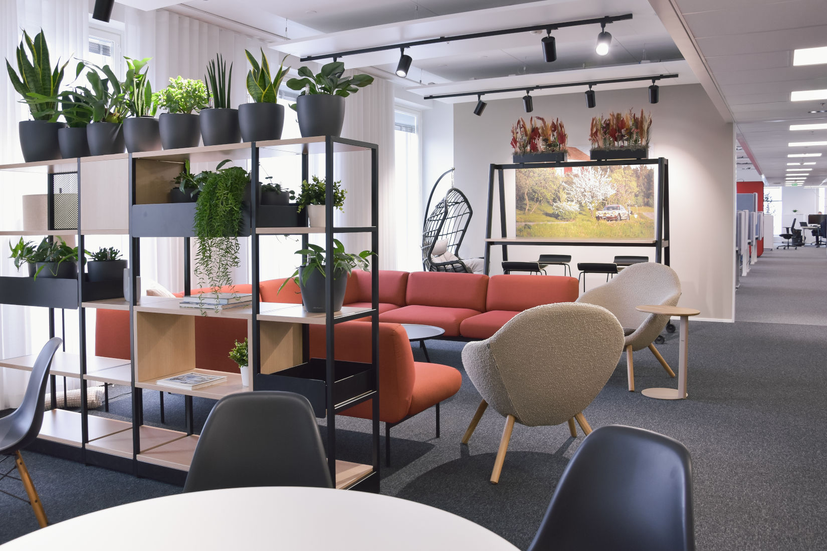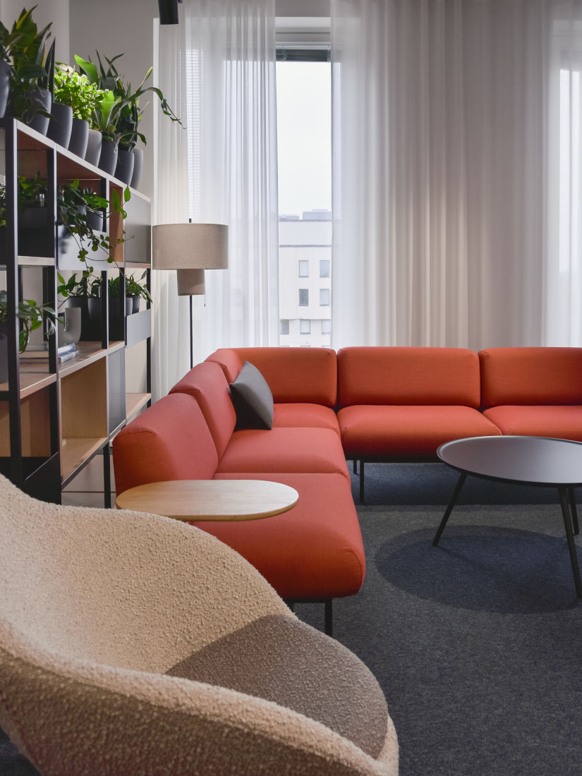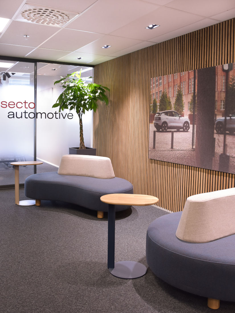 Asiakkaamme Secto Automotiven toimistotiloihin toteutettiin kevyt päivitys, jonka tavoitteena oli yhtenäistää tilojen ilmettä sekä vahvistaa yrityksen brändin näkyvyyttä. Lounge-alueen kalustusta jäsennettiin tukemaan paremmin tilan käyttöä yhteisiin palavereihin ja kohtaamisiin, samalla lisäten tilojen viihtyisyyttä. Sisääntuloaulassa keskityttiin tilan selkeyttämiseen ja yrityksen brändin esiin tuomiseen. Ralliaiheiset akustiikkataulut vahvistavat yrityksen identiteettiä ja tuovat luontevia keskustelunavauksia. Aulaa ja loungea erottava lasiseinä viimeisteltiin näköesteteippauksilla sekä yrityksen logolla. Kalustus- ja materiaalivalinnoissa hyödynnettiin yrityksen värimaailmaa, ja orgaansilla muodoilla sekä viherkasveilla tuotiin sisustukseen pehmeyttä. Lopputuloksena on viihtyisä ja yhtenäinen kokonaisuus, jossa kohdata työkavereita ja ottaa vieraita vastaan.